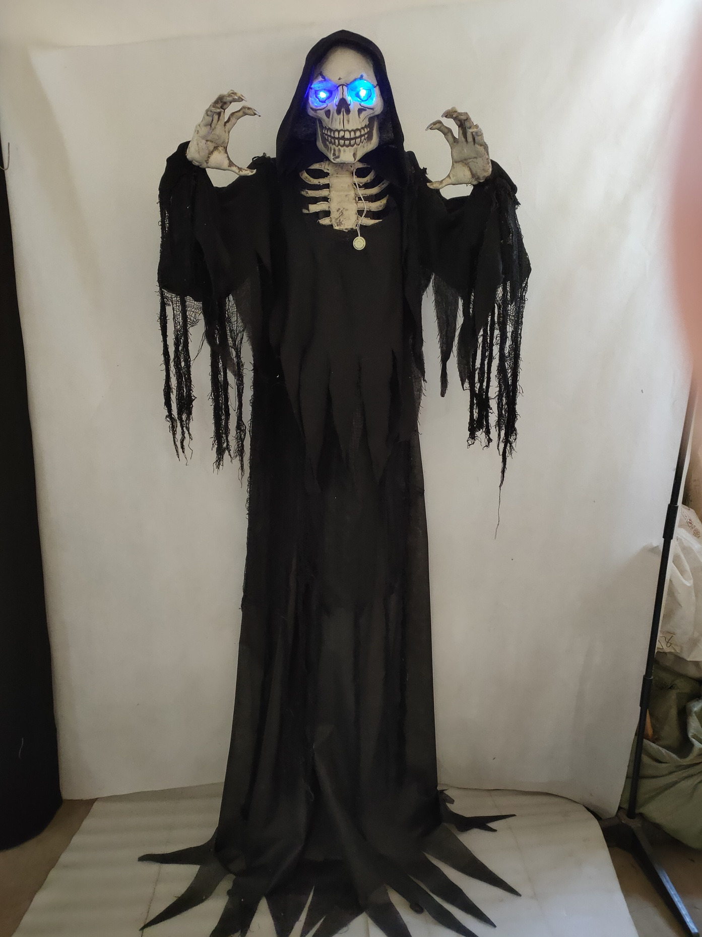 - Elevate Your Halloween with Our Enchanting Hanging Grim Reaper Decoration! Transform your Halloween celebration with our Spooky Hanging Grim Reaper Decoration. This 197cm tall Grim Reaper is made of high-quality black velvet fabric, featuring glowing and blinking eyes, and a chilling sound effect. It's the perfect addition to your Halloween decor. Easy Installation & Storage This lightweight decoration can be easily hung anywhere. The Reaper sways with the wind, adding an extra layer of spookiness to your Halloween night. After the celebration, simply store it in a dry place for easy reuse next year. Ideal for Halloween Atmosphere Crafted with high-quality materials, our Hanging Grim Reaper is designed to enhance the Halloween atmosphere of your home. Whether placed in your lawn, yard, porch, or patio, this decoration is sure to catch everyone's attention and spook your neighbors. Premium Quality & Safety Made from durable black velvet fabric, this decoration is built to last. It has passed safety tests, ensuring it is safe for you and your family to enjoy. Customer Satisfaction Guaranteed We prioritize providing an excellent shopping experience for our customers. If you have any issues or the product does not meet your expectations, feel free to contact us through “contact sellers” for assistance.