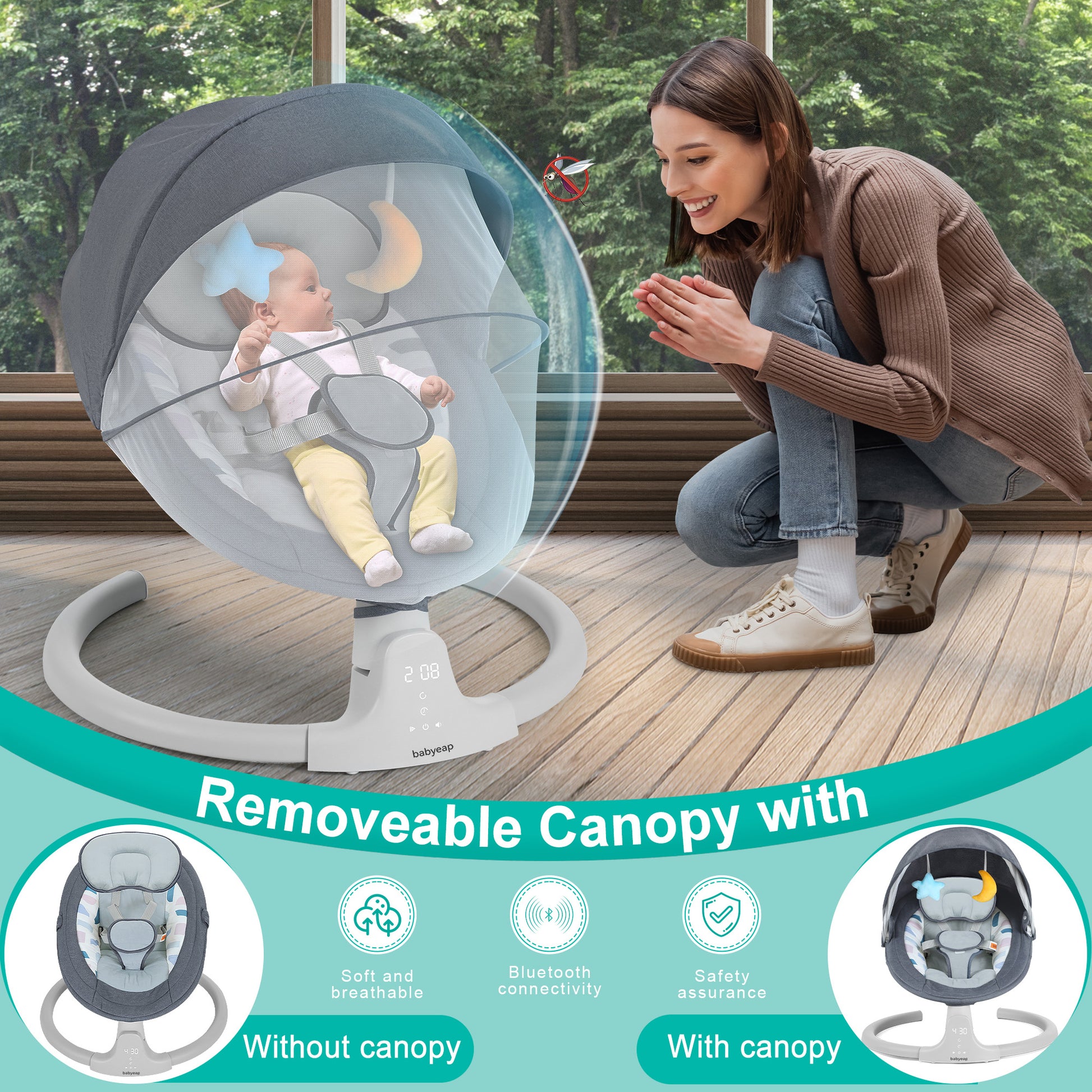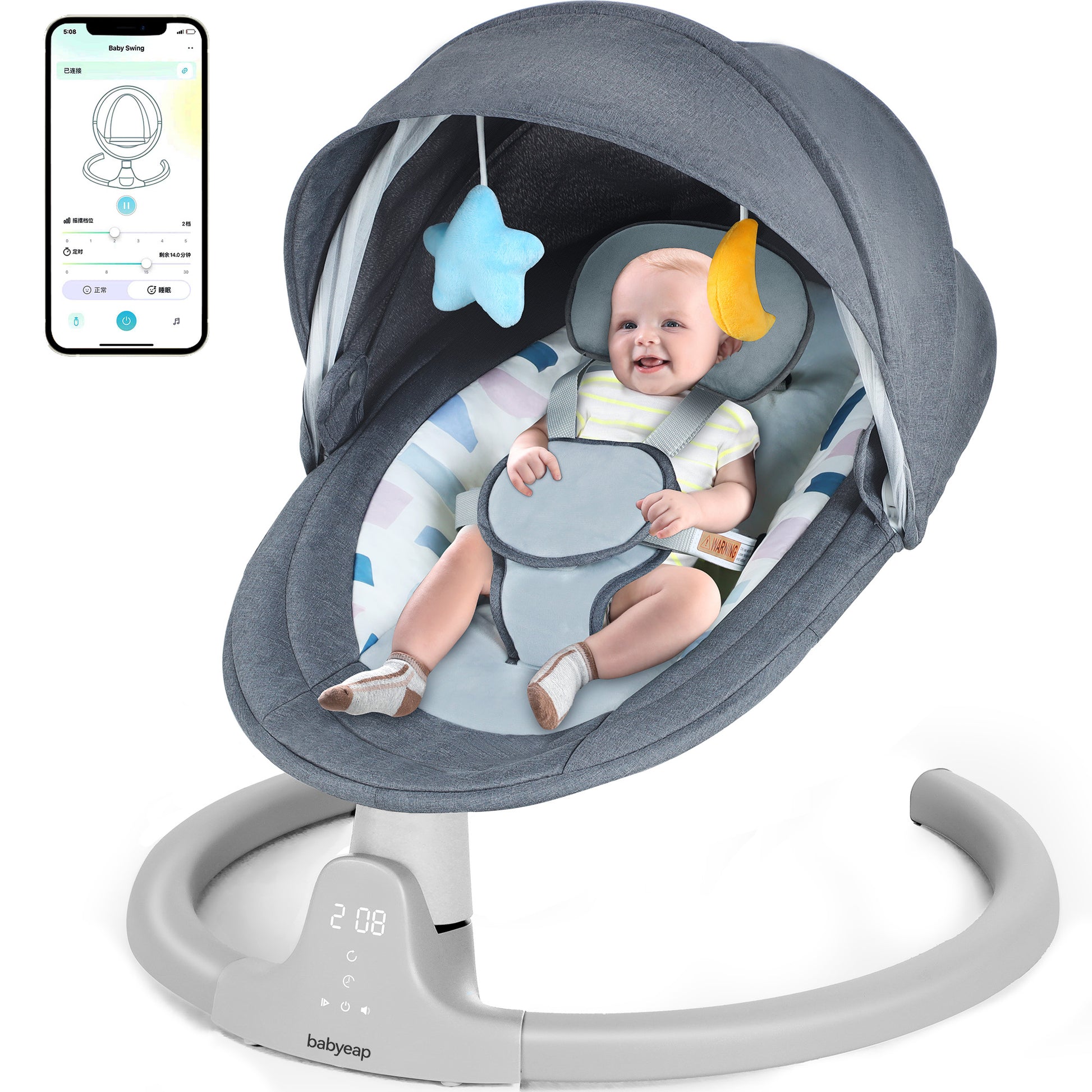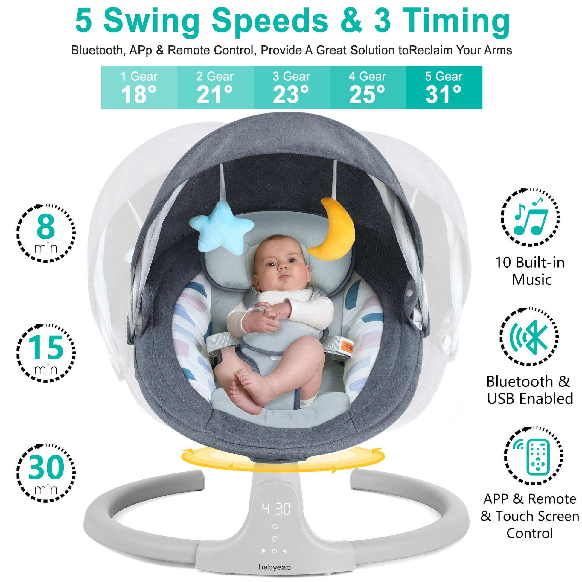 - Our baby swings come with 10 built-in soft lullabies to help relax your baby. Additionally, the Bluetooth music speaker allows you to play your baby's favorite music or story from your phone, keeping them entertained and happy.