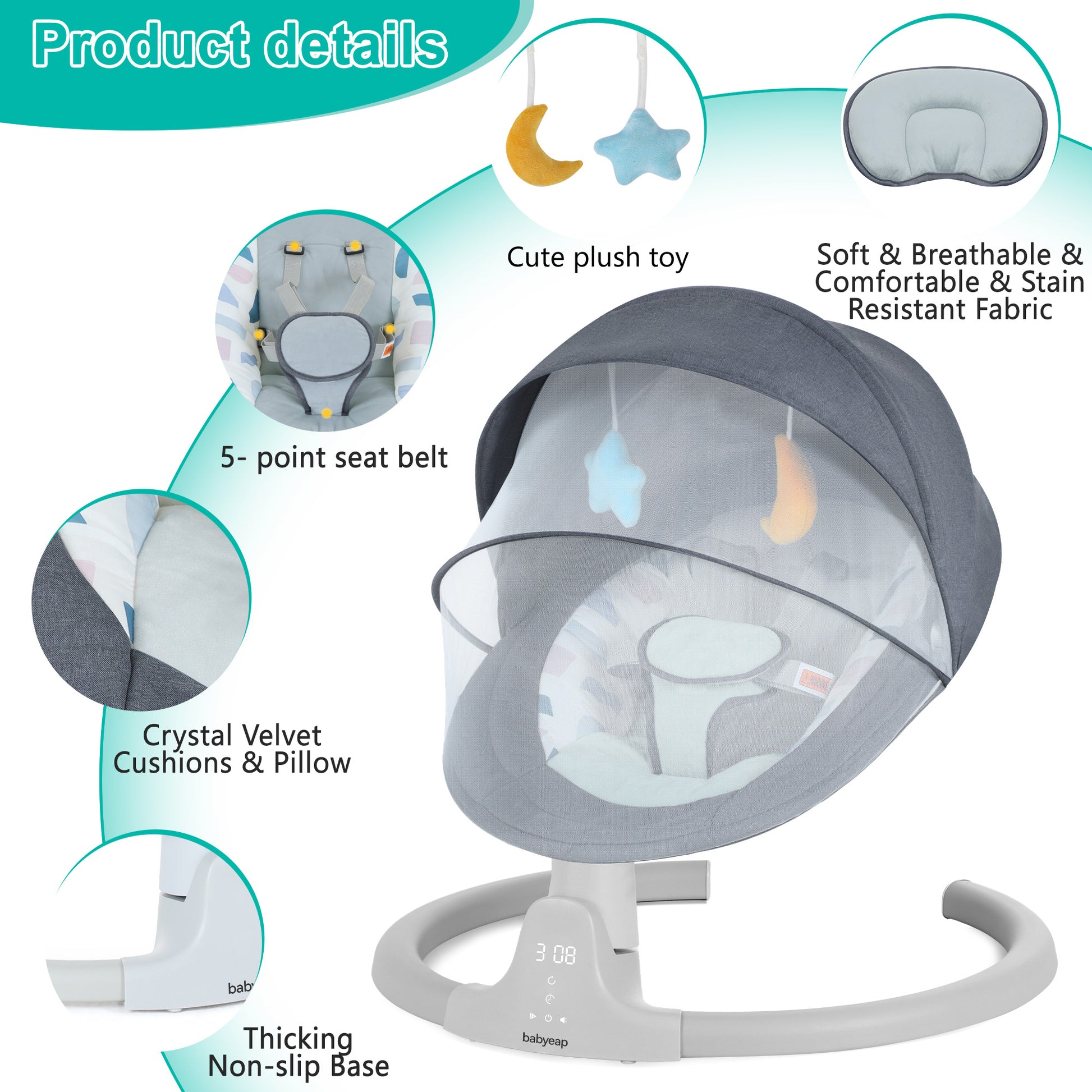 - Our baby swings feature a large and adjustable safety belt that ensures your baby feels secure and protected while enjoying themselves.
