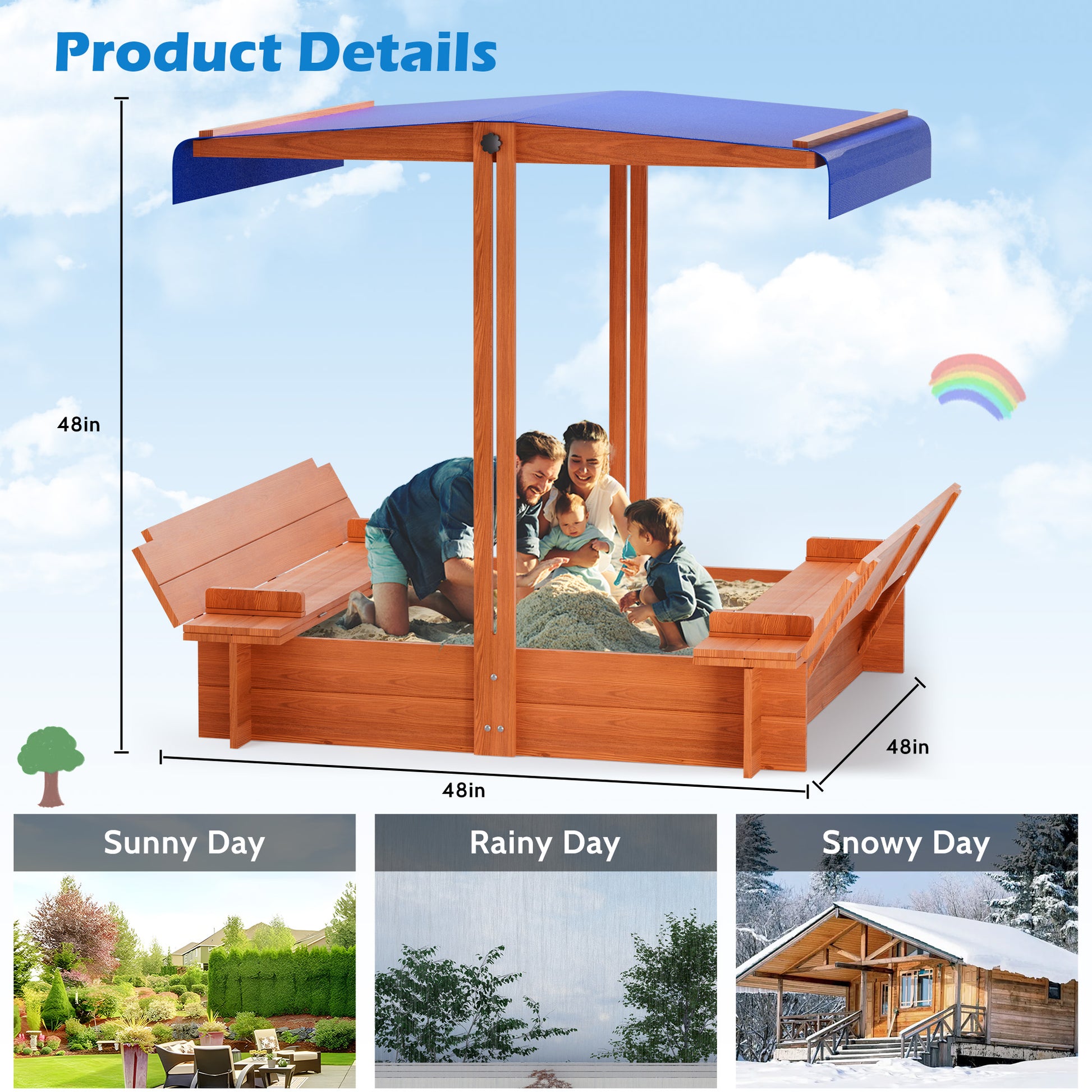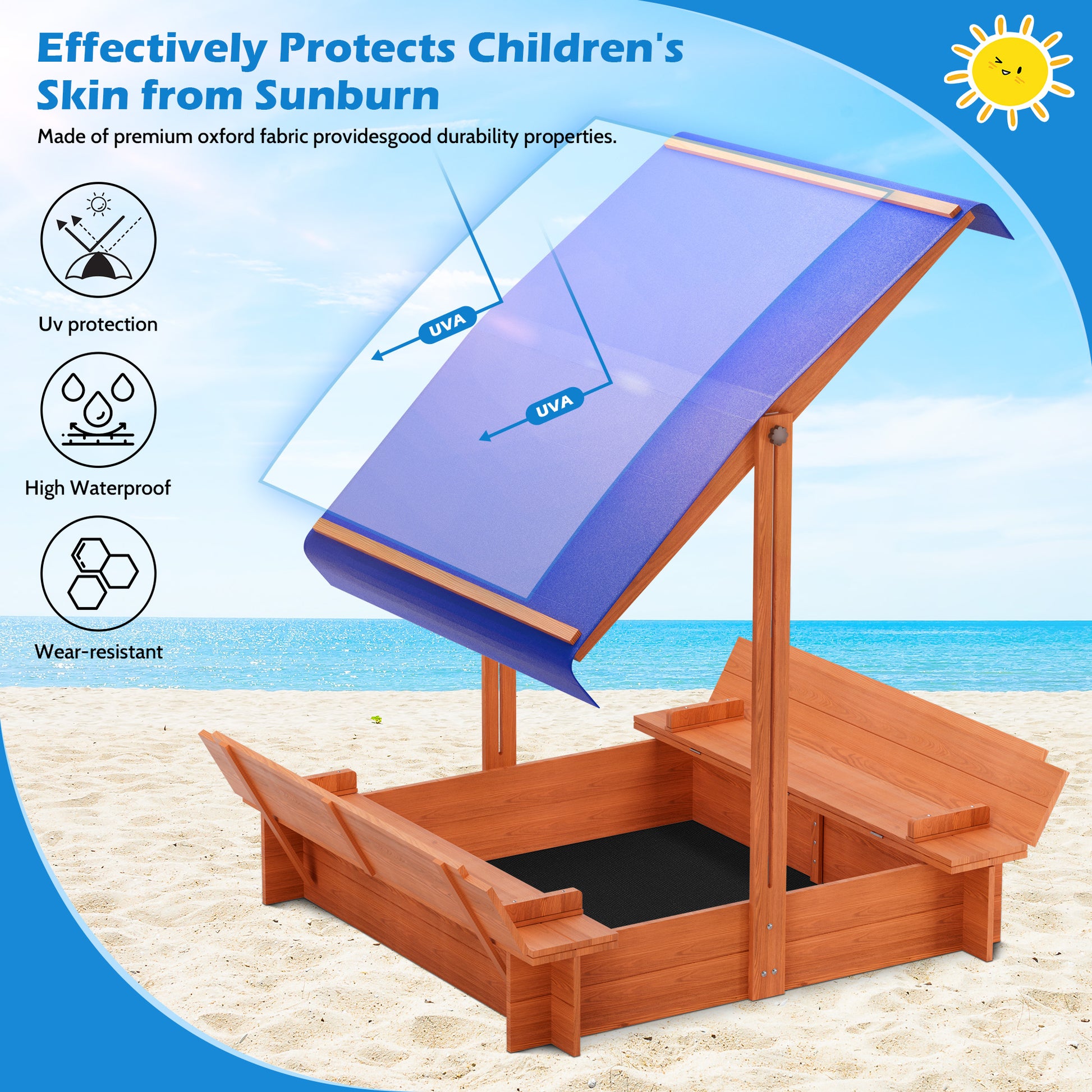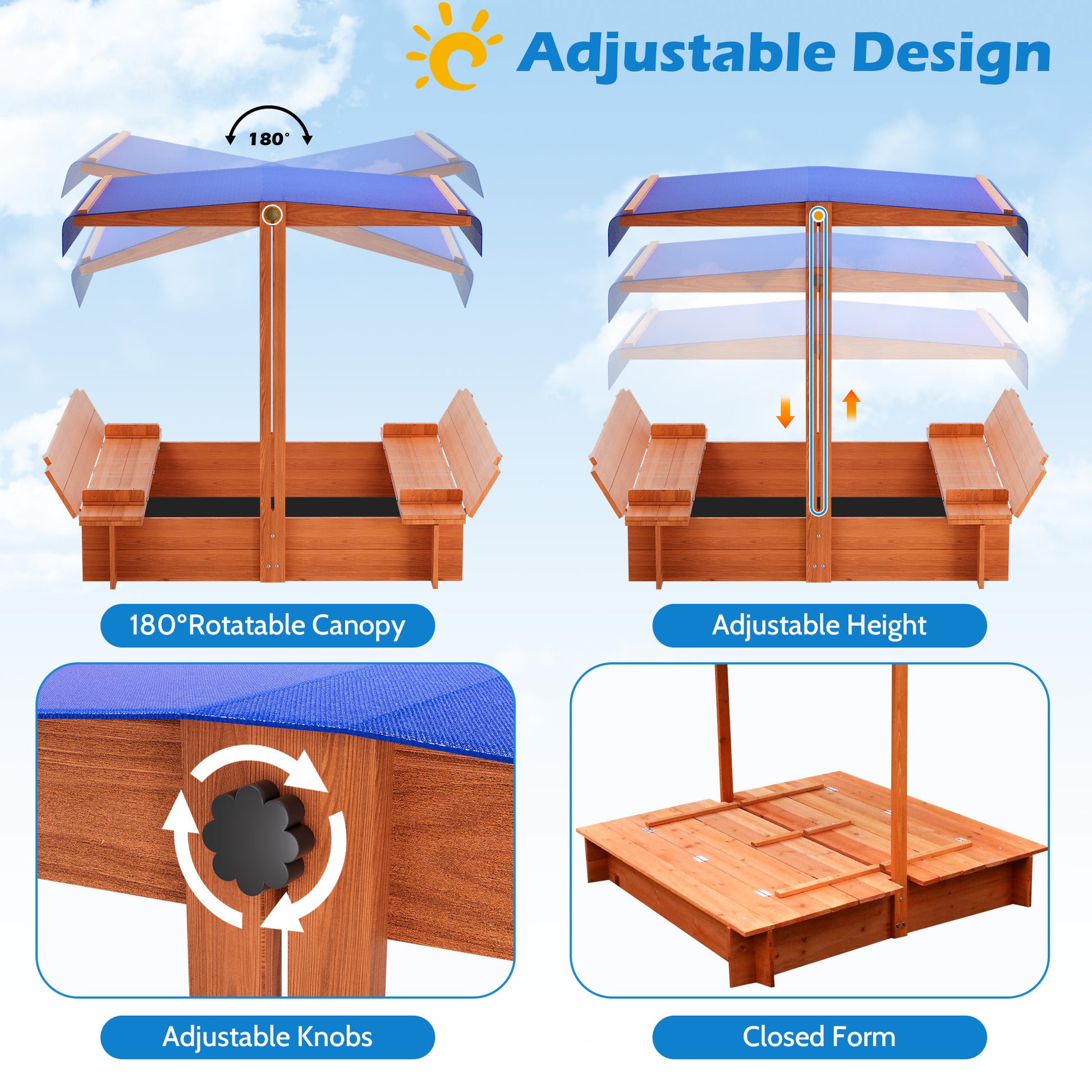 - 【Practical and Multi-functional Design】This outdoor large sandbox is designed to be practical and multi-functional, the foldable design sand box sandbox with cover can be easily opened to turn into two comfortable benches, providing 48 inches wide seats and 7.6 inches high backrests to ensure your children's safety while playing. When play is over, the sandbox lid can be closed to protect the sand from animals and debris. The roof swivels 180° and is height adjustable up and down to provide optimal shade depending on the sun position, allowing kids to enjoy longer hours of beach fun outdoors while preventing UV damage. When you don't need the roof, you can also remove the poles and canopy to save volume.There is a black non-woven fabric underneath the Sand box, and the bottomless design ensures good drainage and ventilation.