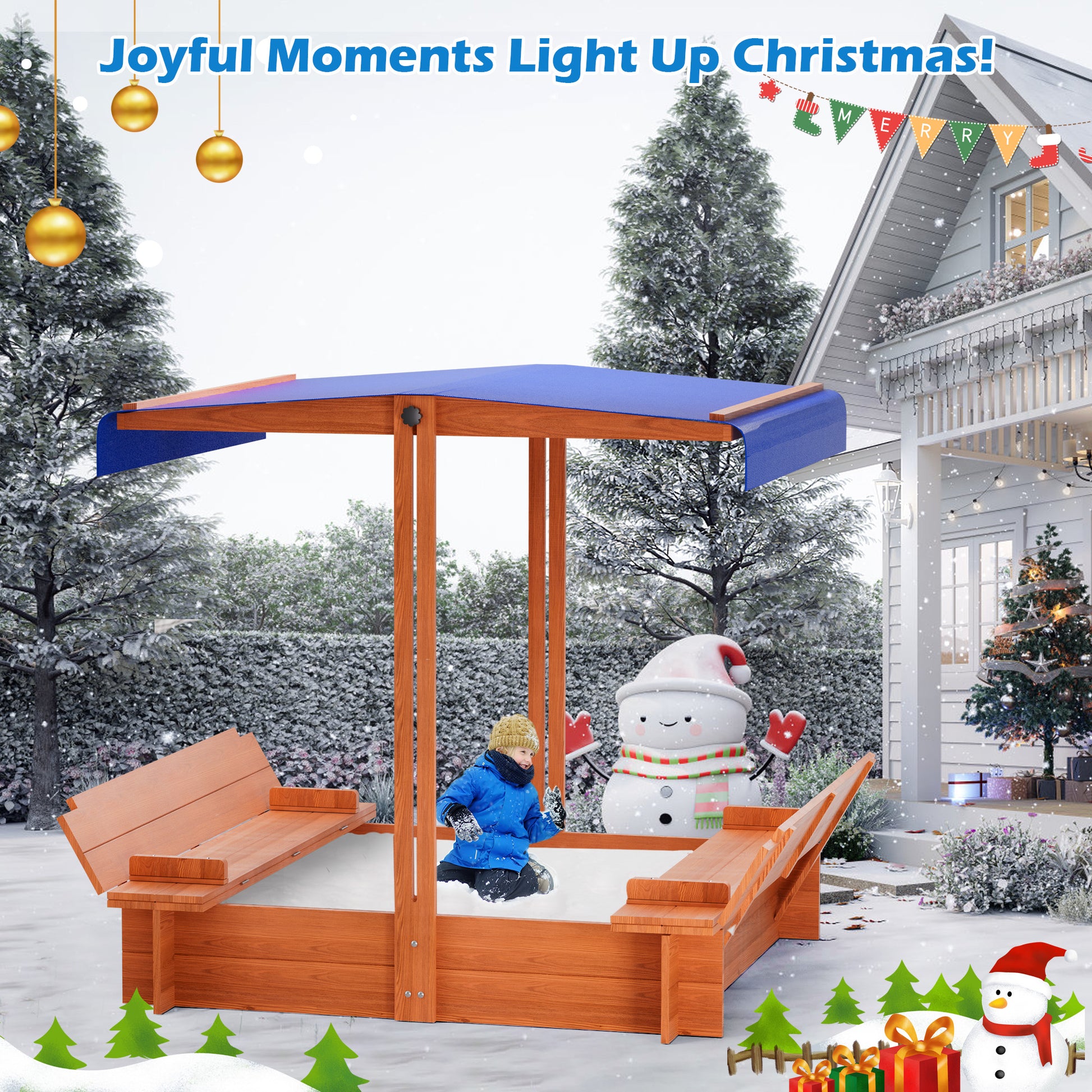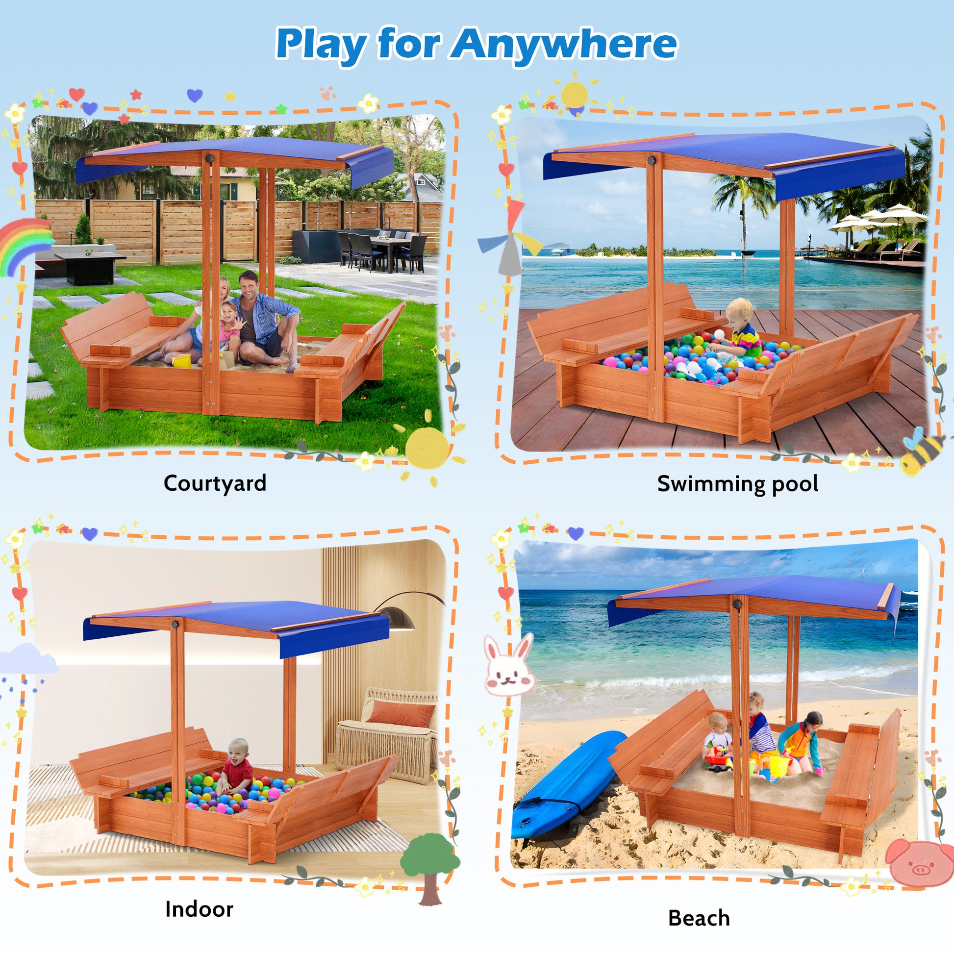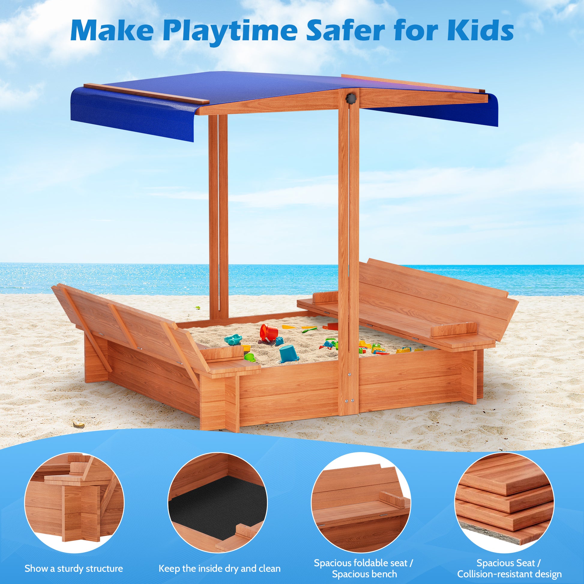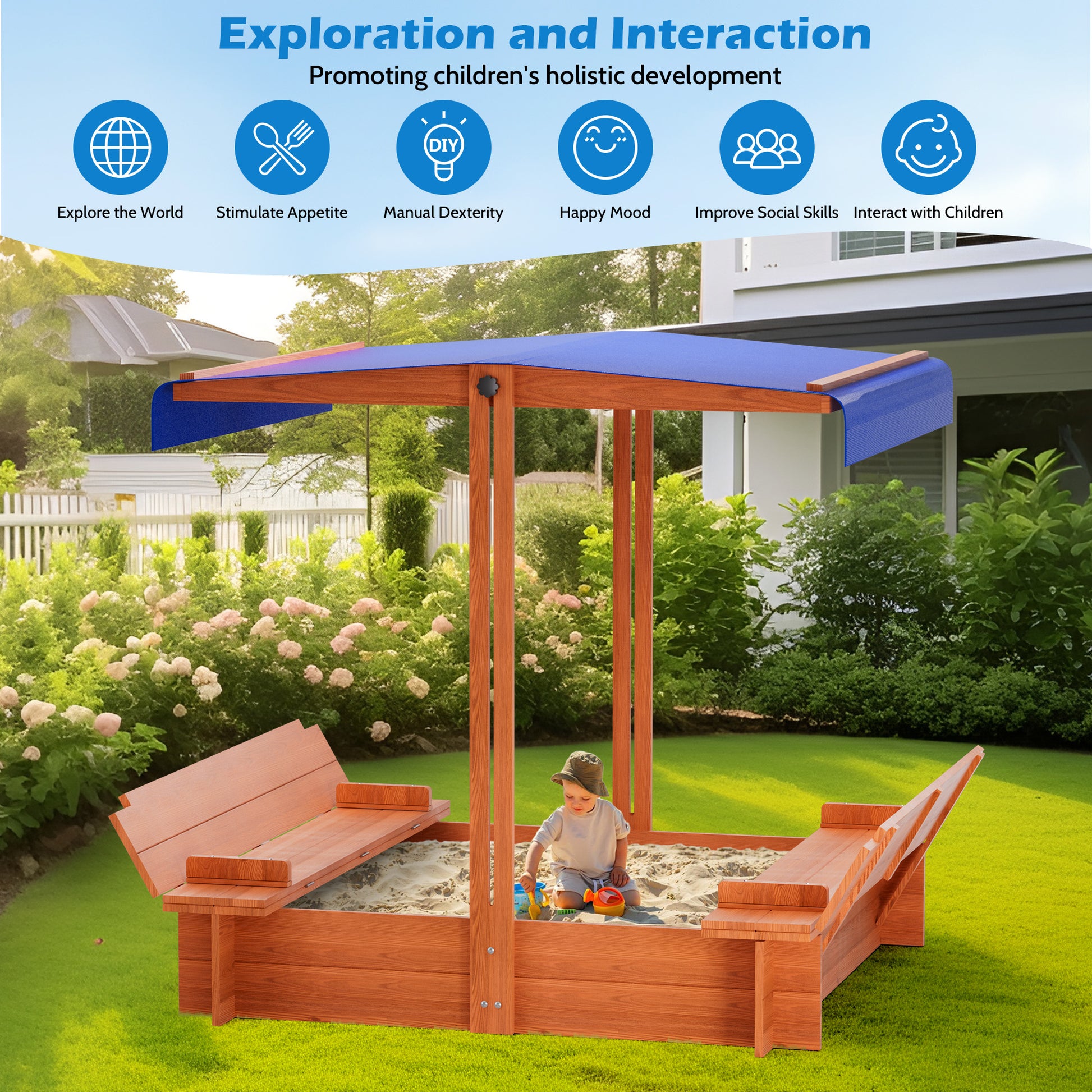 - 【Practical and Multi-functional Design】This outdoor large sandbox is designed to be practical and multi-functional, the foldable design sand box sandbox with cover can be easily opened to turn into two comfortable benches, providing 48 inches wide seats and 7.6 inches high backrests to ensure your children's safety while playing. When play is over, the sandbox lid can be closed to protect the sand from animals and debris. The roof swivels 180° and is height adjustable up and down to provide optimal shade depending on the sun position, allowing kids to enjoy longer hours of beach fun outdoors while preventing UV damage. When you don't need the roof, you can also remove the poles and canopy to save volume.There is a black non-woven fabric underneath the Sand box, and the bottomless design ensures good drainage and ventilation.