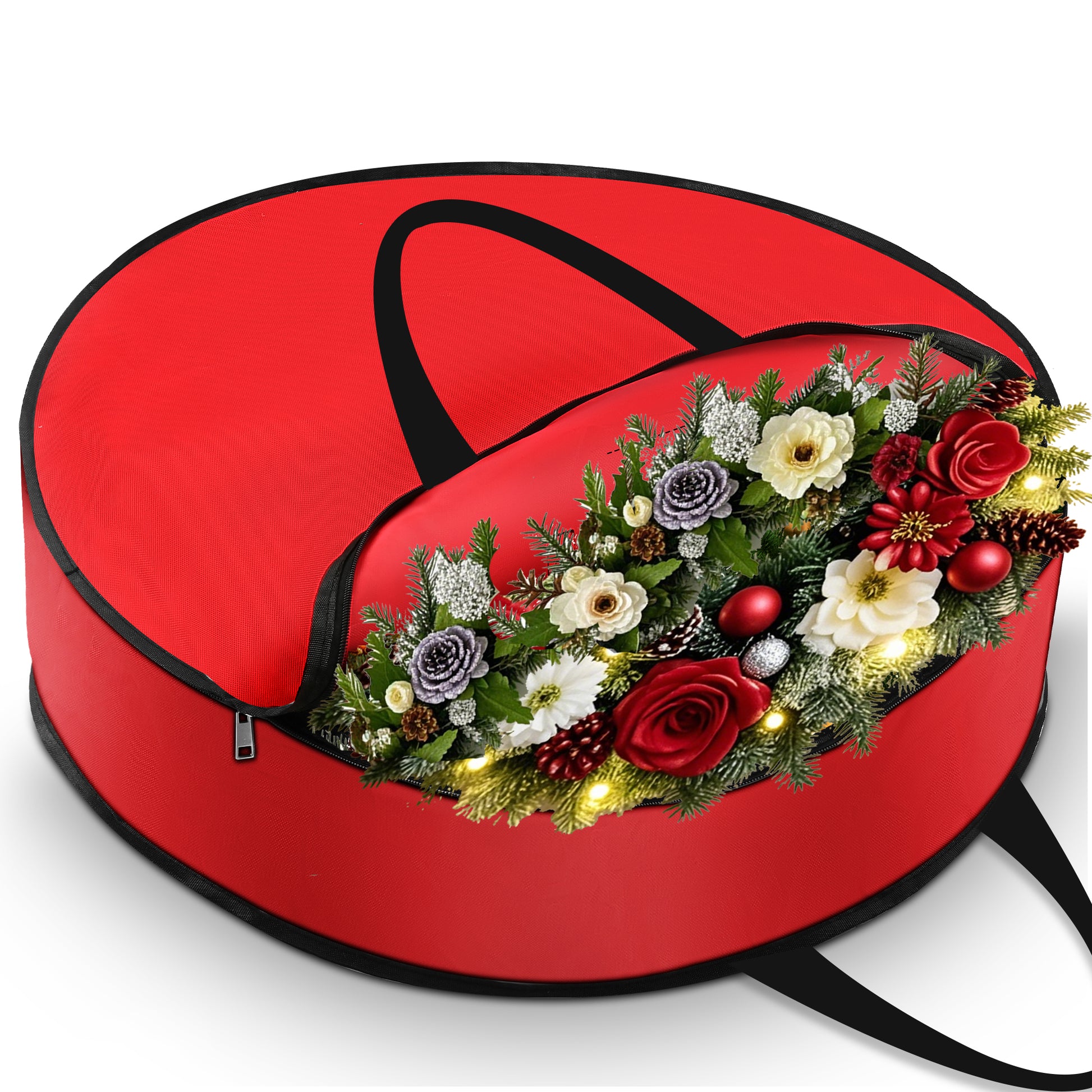 Firstness Christmas Wreath Storage, 600D Oxford Round Storage Bag, Waterproof Wreath Storage Container with Durable Reinforced Handles & Dual Zipper, Red