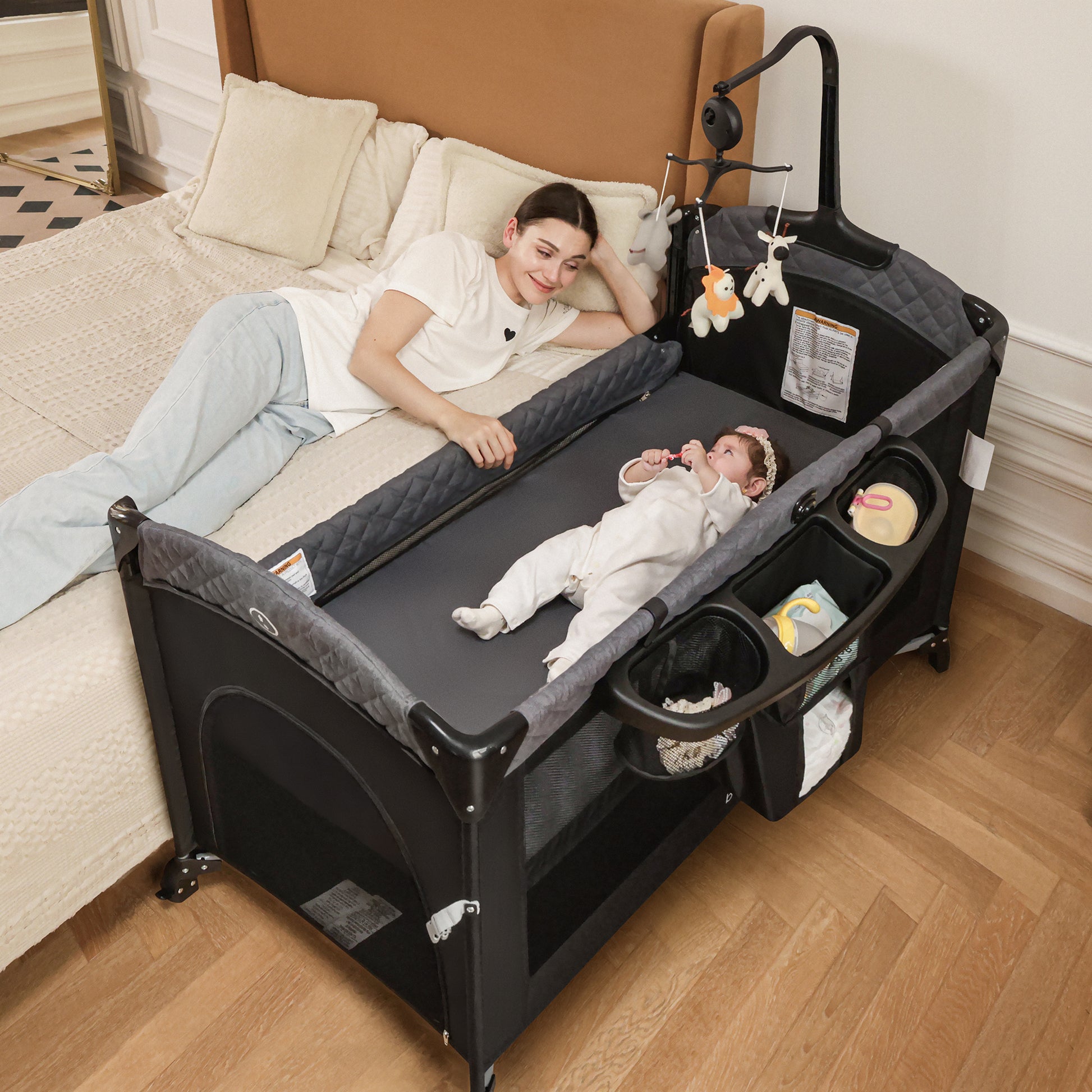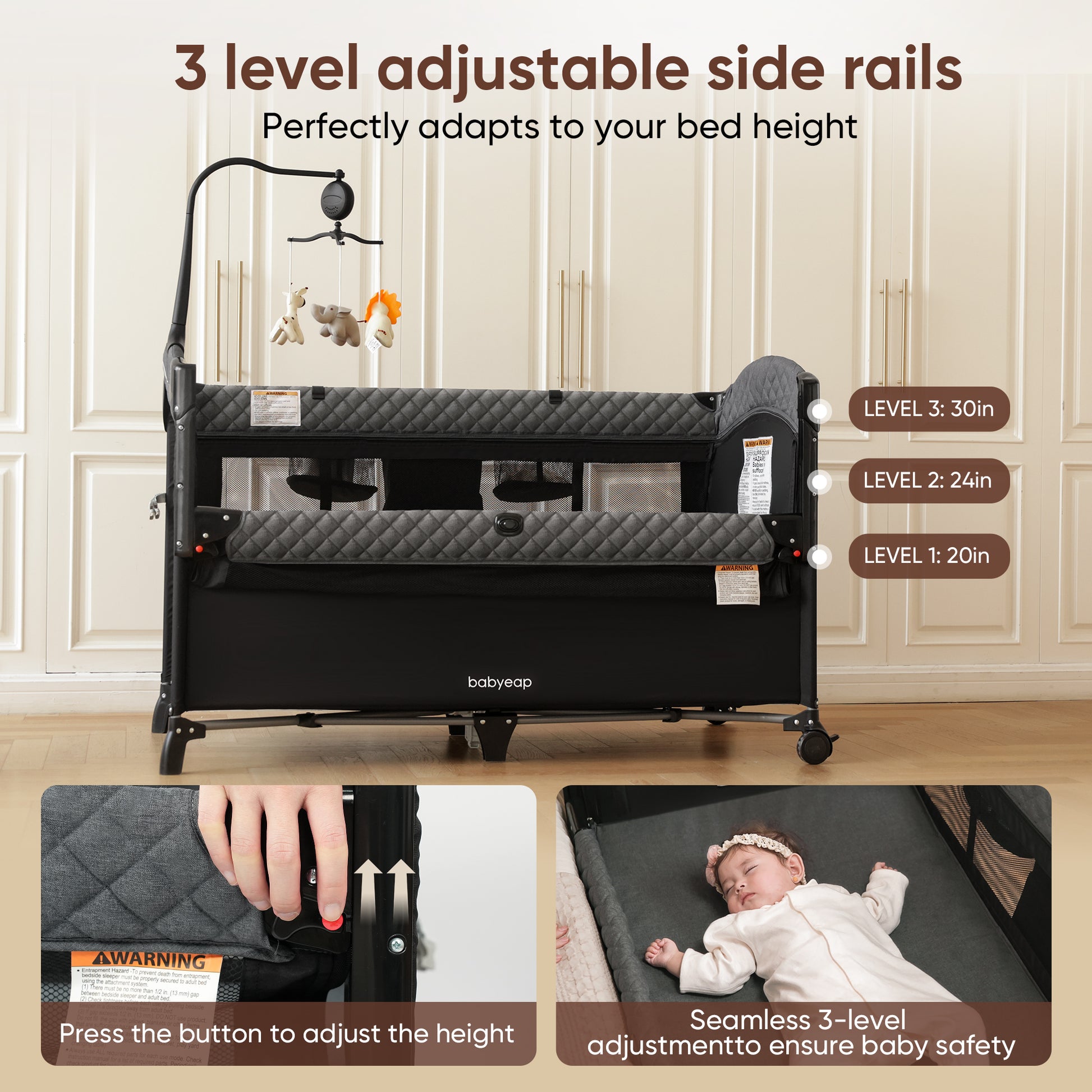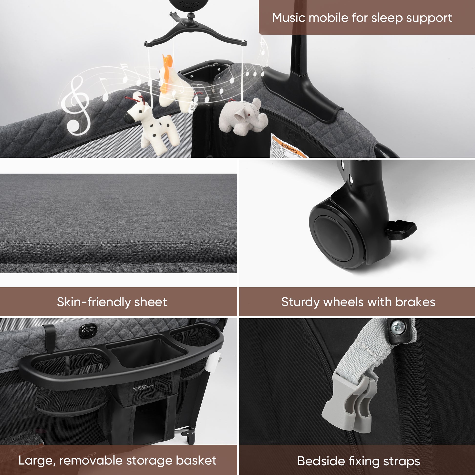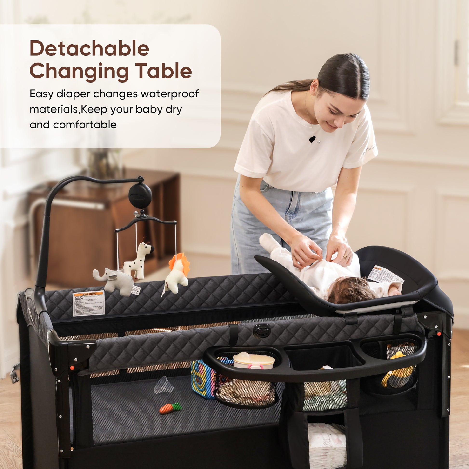5-in-1 portable baby playard combines 5 modes: bedside sleeper, rocking bassinet, portable crib, playpen, and changing table.