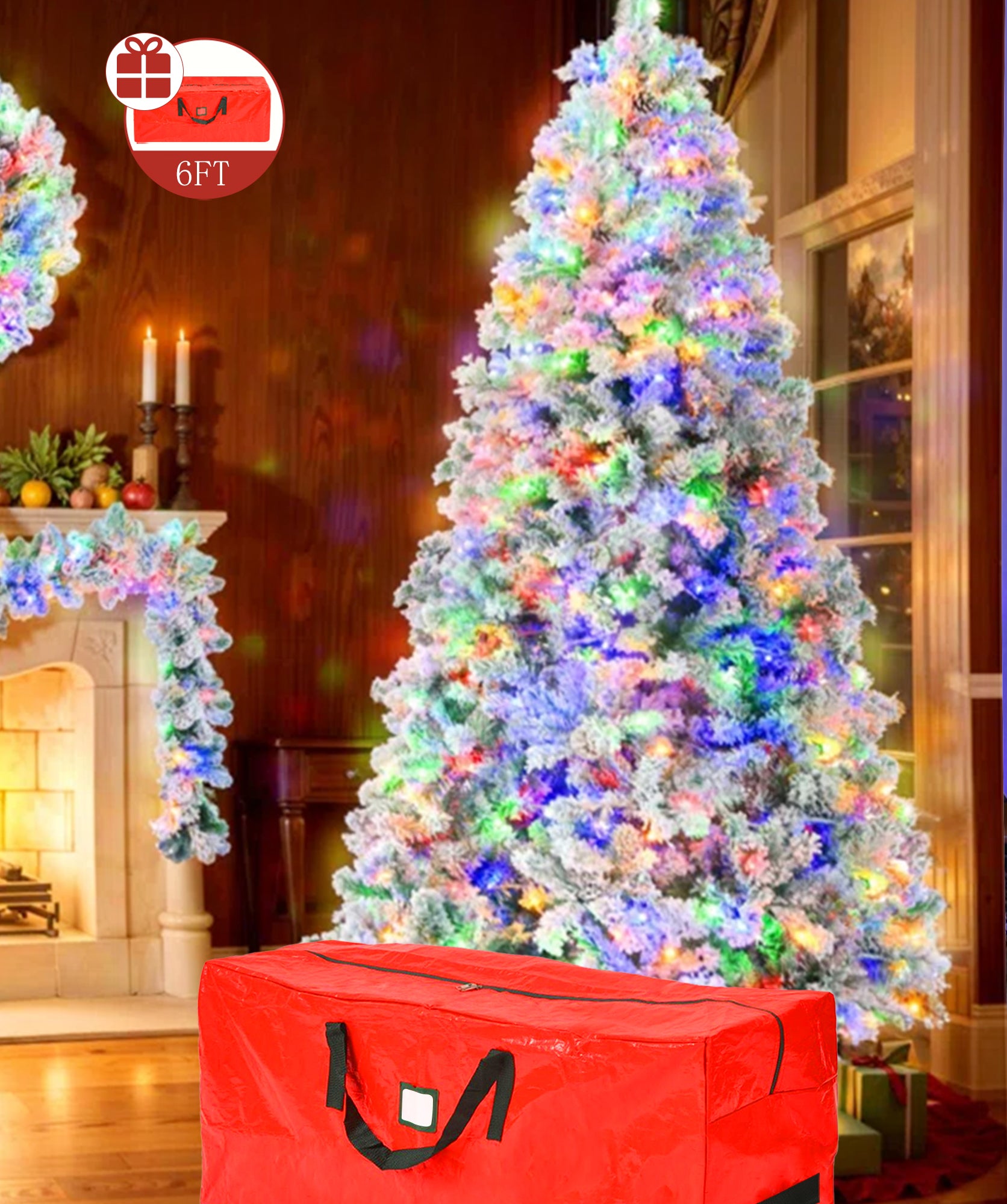 Yexmas 6ft Snow Flocked Christmas Tree, Pre-Lit Artificial White Christmas Tree with 1000 Branch Tips、300 Warm White Lights