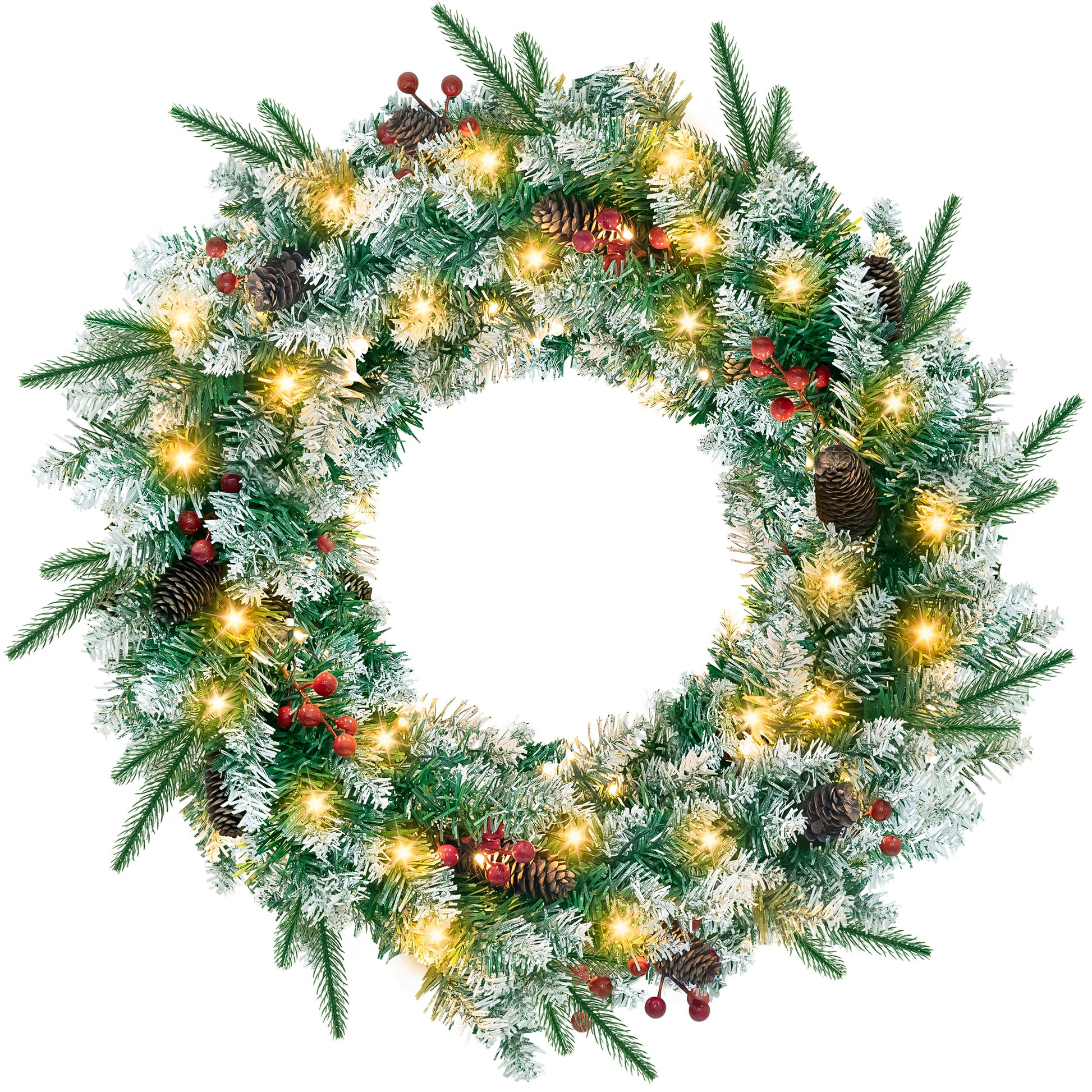 Yexmas Christmas wreath for front door features warm white LED lights and combines PE branches with PVC flocked branches to create a lush and elegant wreath. Lighted christmas wreath made from high-quality materials, it ensures durability and safety in various weather conditions. Adorned with pine cones and red berry garlands, this outdoor christmas wreath is perfect for decorating your front door or indoor spaces, adding a cozy festive atmosphere to your home.