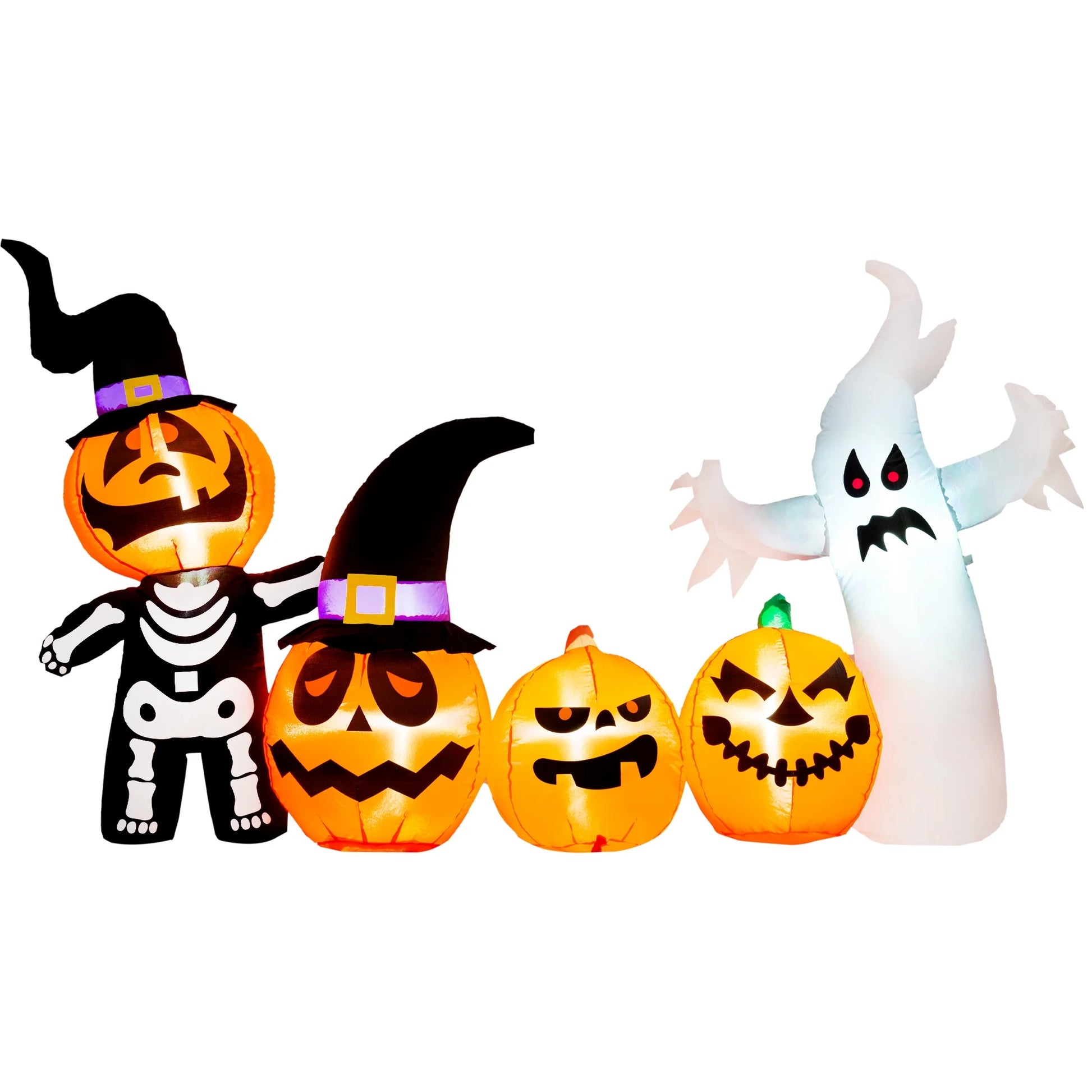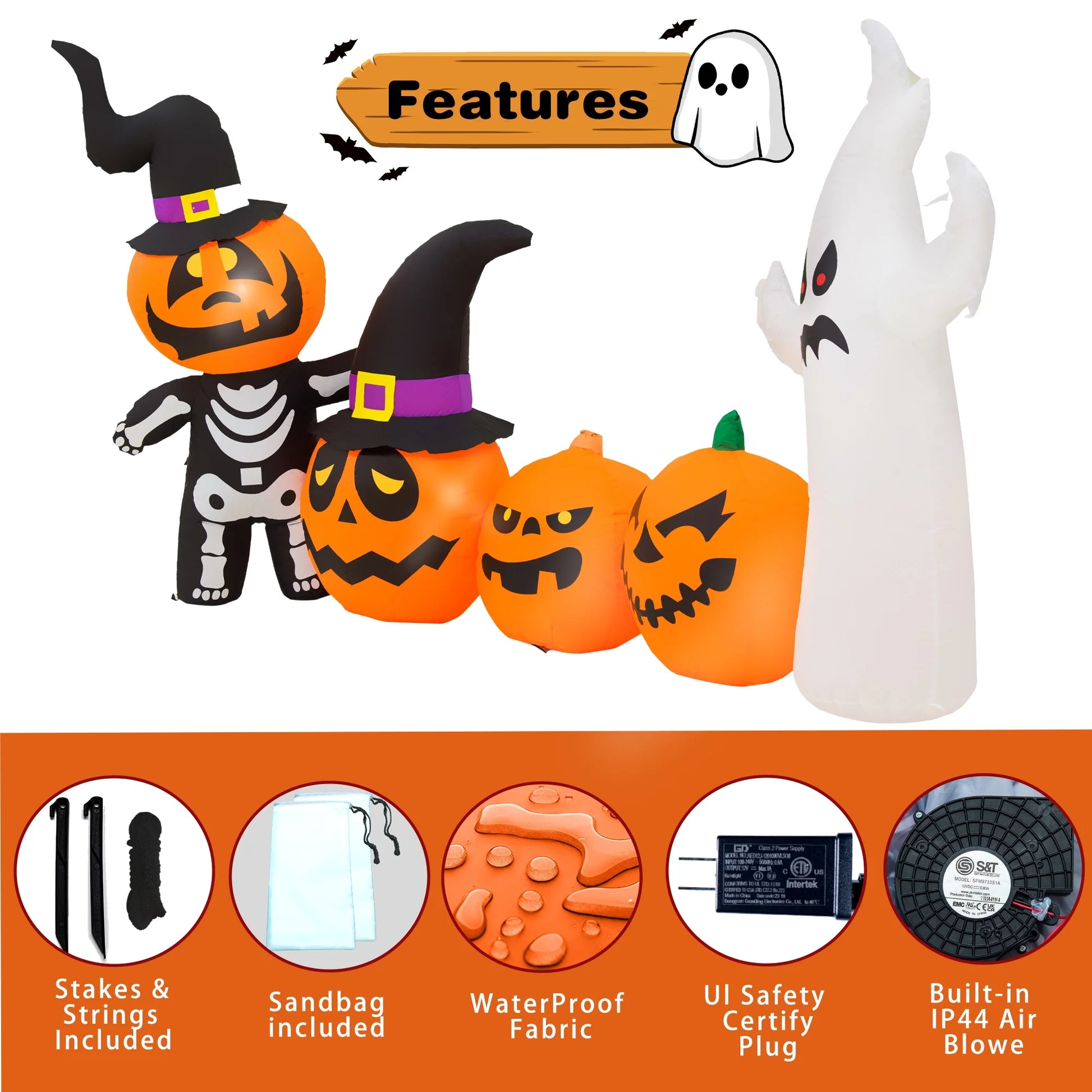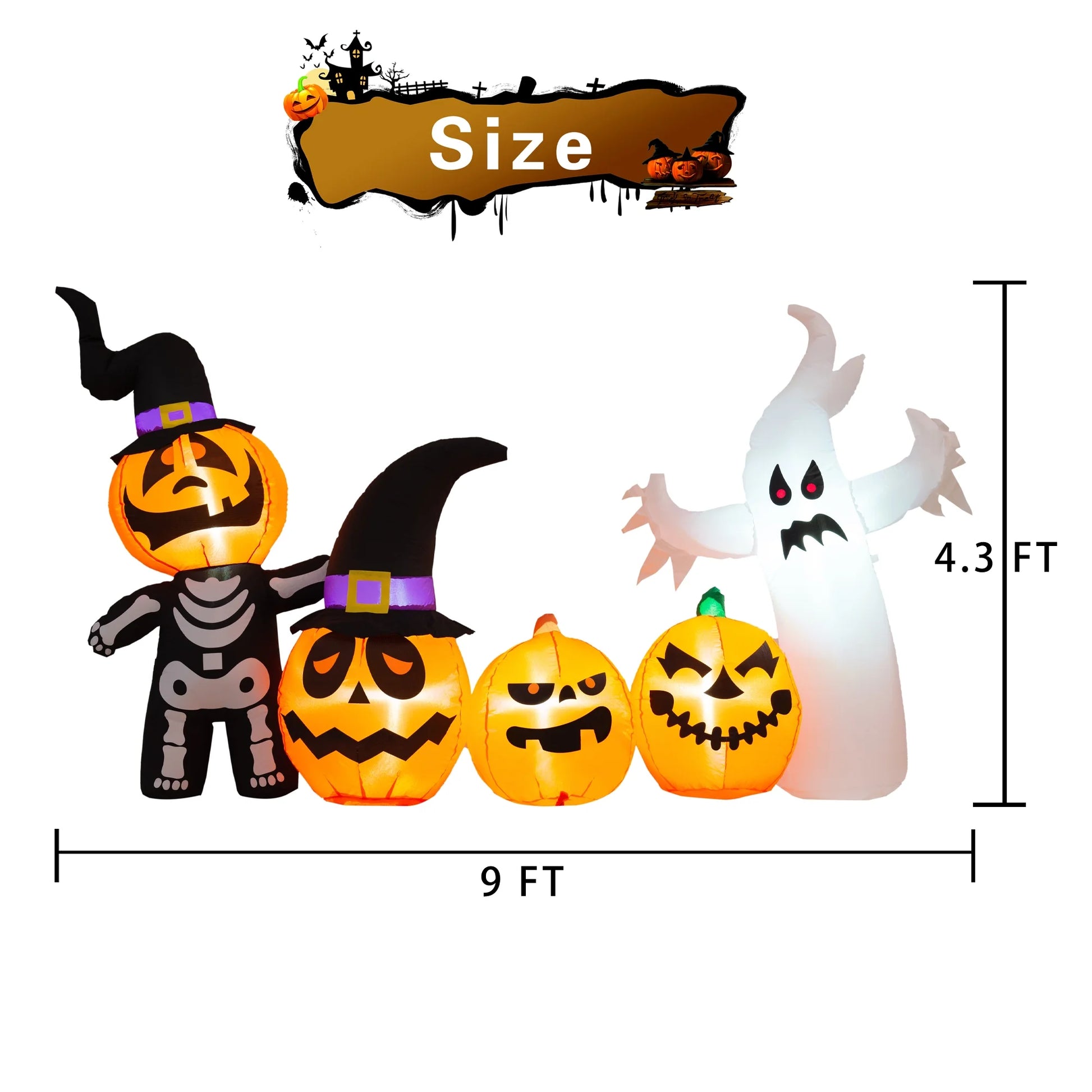 Yexmas Halloween Inflatables, 9 FT Long 4 Pumpkins with Cute White Ghost Outdoor Decorations, Built-in LEDs, Blow Up Party, Waterproof Yard, Garden, Lawn Decor.