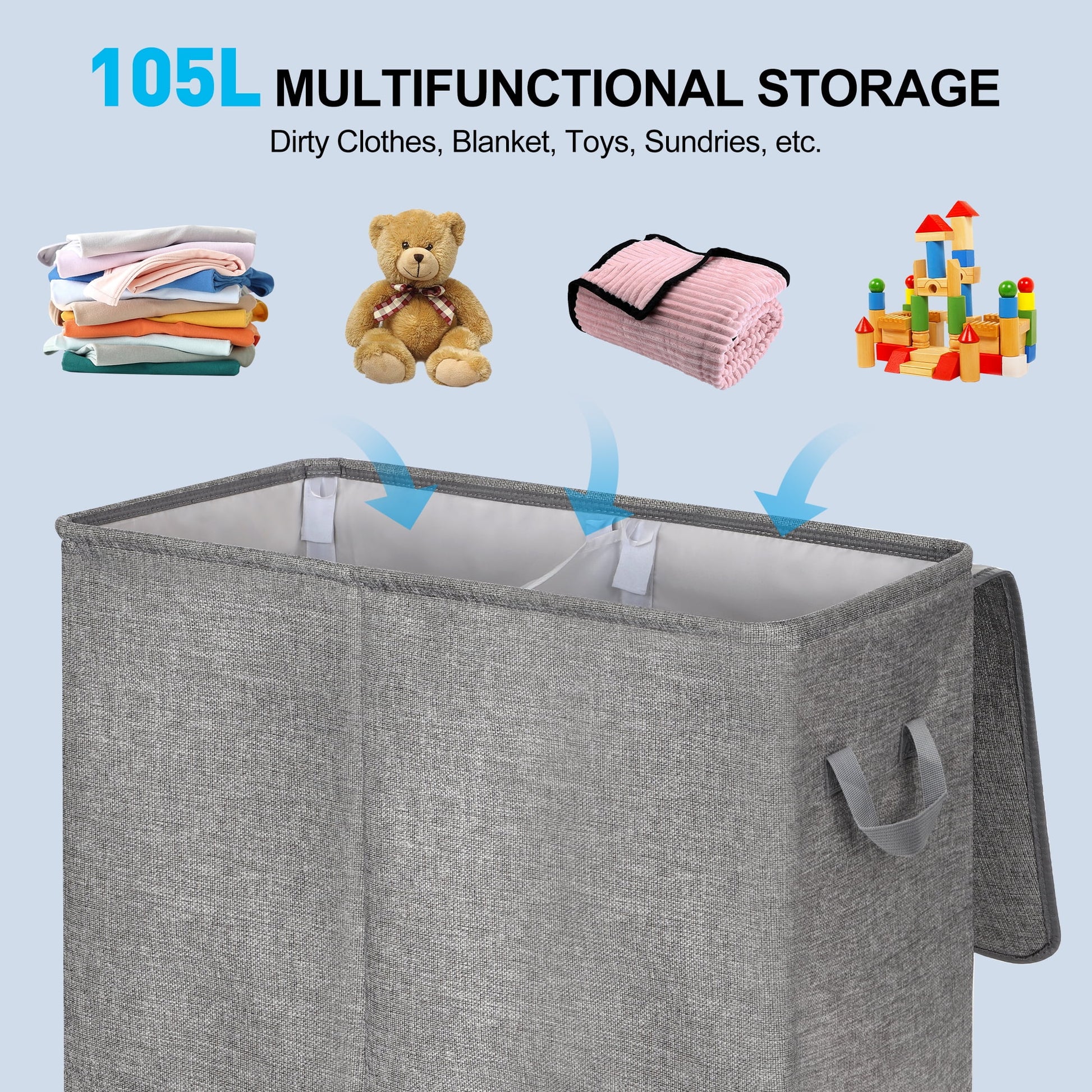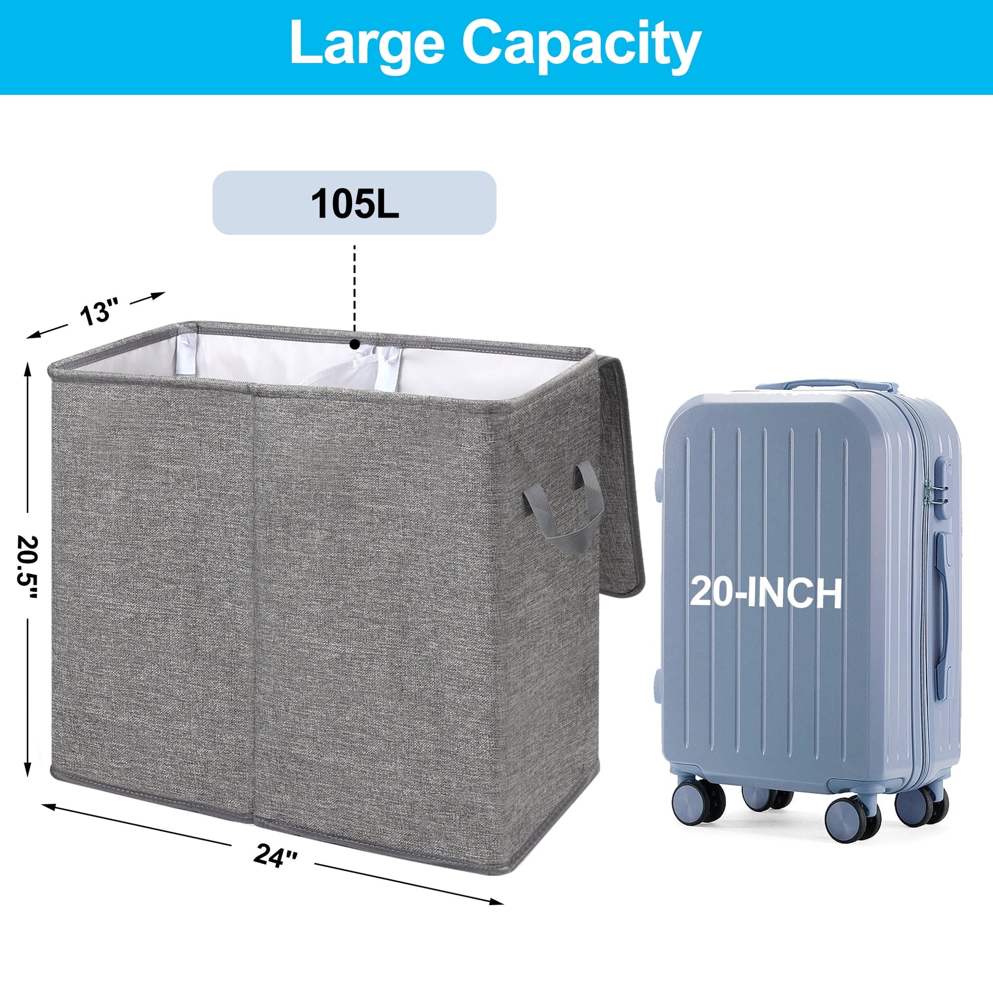 - 【105L Laundry Hamper 2 Section】Dual laundry hampers standing size 24"×13"×20.5", 105L large capacity laundry basket to meet the week's change of clothes storage, reduce the number of weekly trips to the laundry room. Large collapsible laundry baskets can also be used to store other sundries such as bedding, toys, and dolls. You can easily separate darks and lights, clothing from linens, his and her items, or child and adult pieces.