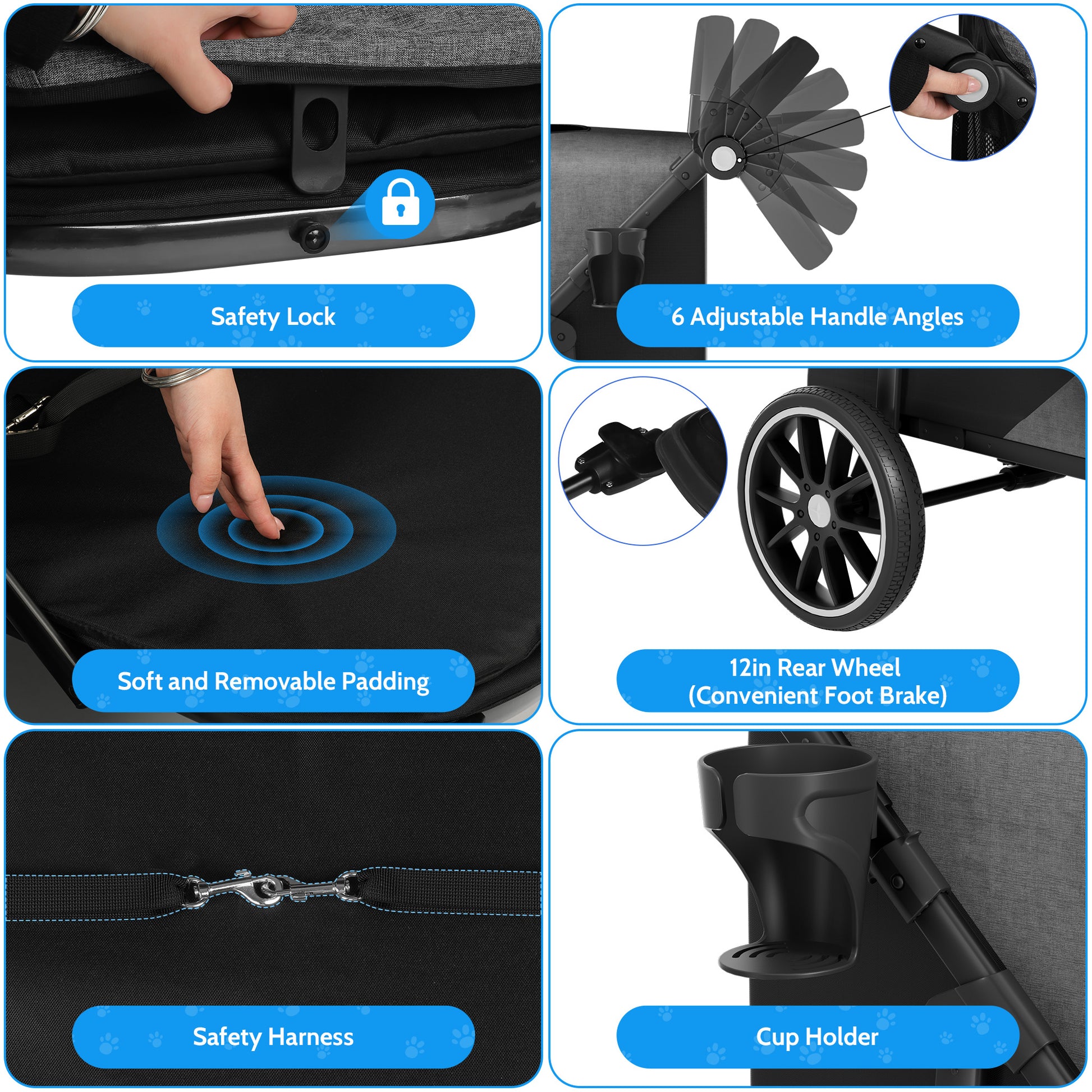 【🐶Extra-Large Capacity Pet Stroller】 This large pet stroller is specifically designed for large dogs, senior dogs, and multi-pet families. Its spacious compartment can accommodate pets up to 132 lbs, providing ample room. The durable materials and sturdy construction, along with padded interiors, ensure your pet's safety and comfort. The adjustable padded handle and multiple height settings make it suitable for users of different heights. Equipped with a safety buckle, scratch-resistant mesh, and storage bag, this stroller is perfect for daily walks, shopping, and vet visits.