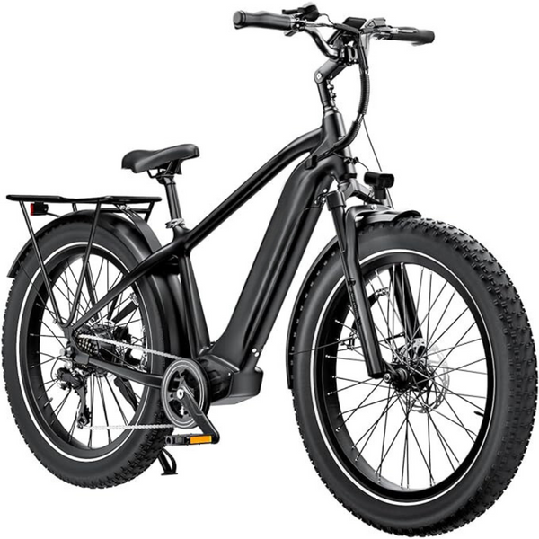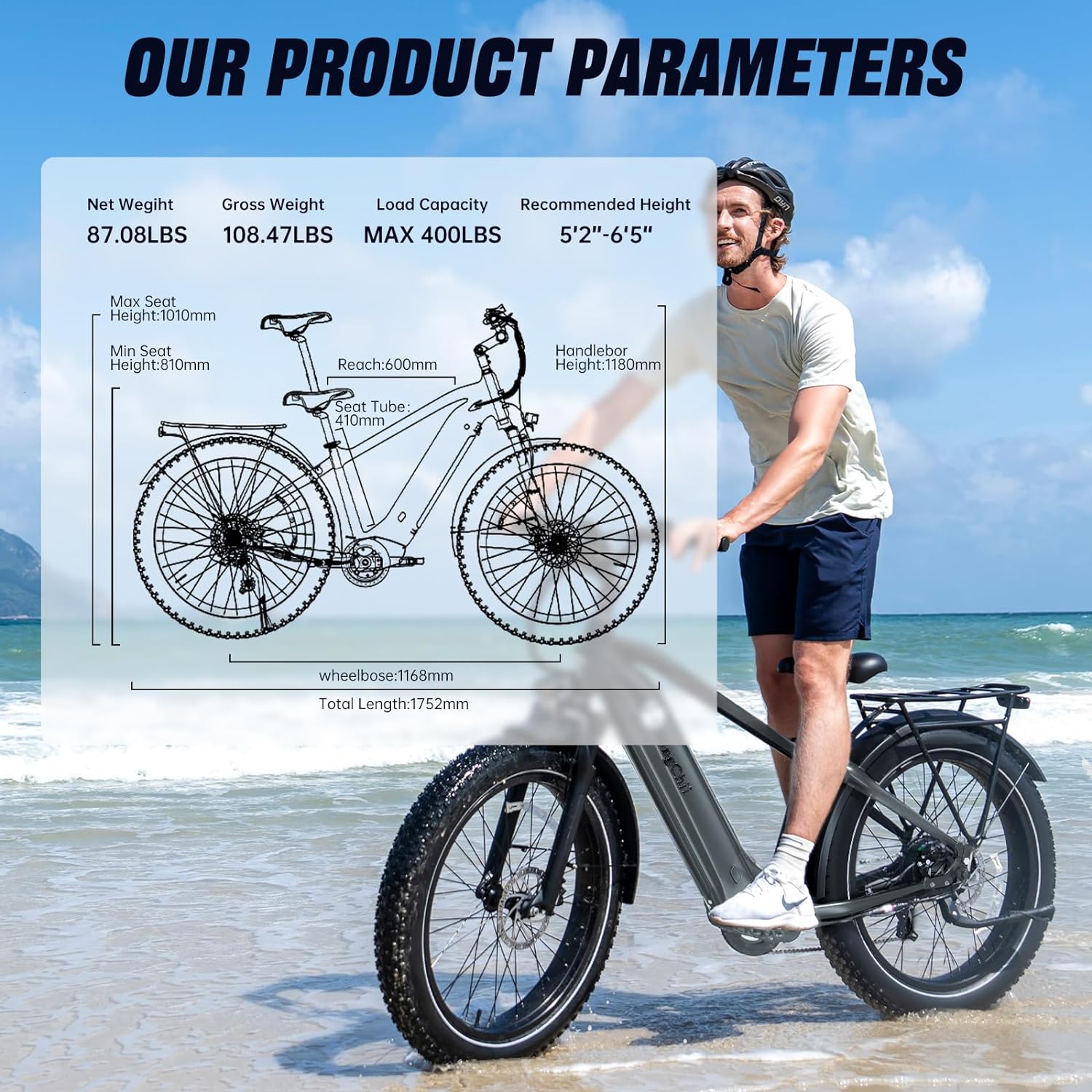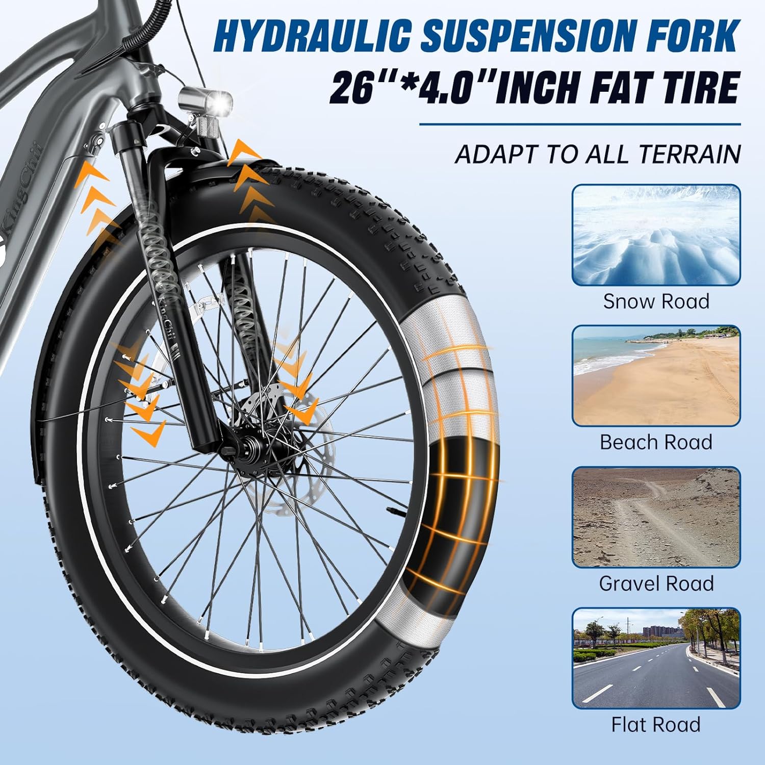 - [RELIABLE RIDING SAFETY SYSTEM] High-strength large hydraulic suspension front fork and 26"*4.0" fat tires makes it easy for you to control off-road or terrain with huge drop. Dual hydraulic disc brakes system enable the ebike to stop quickly and smoothly even when riding at high speed. Shortening the braking distance even on wet road.The most stable triangular frame design ensures that the frame of the electric bike is not easily deformed when subjected.