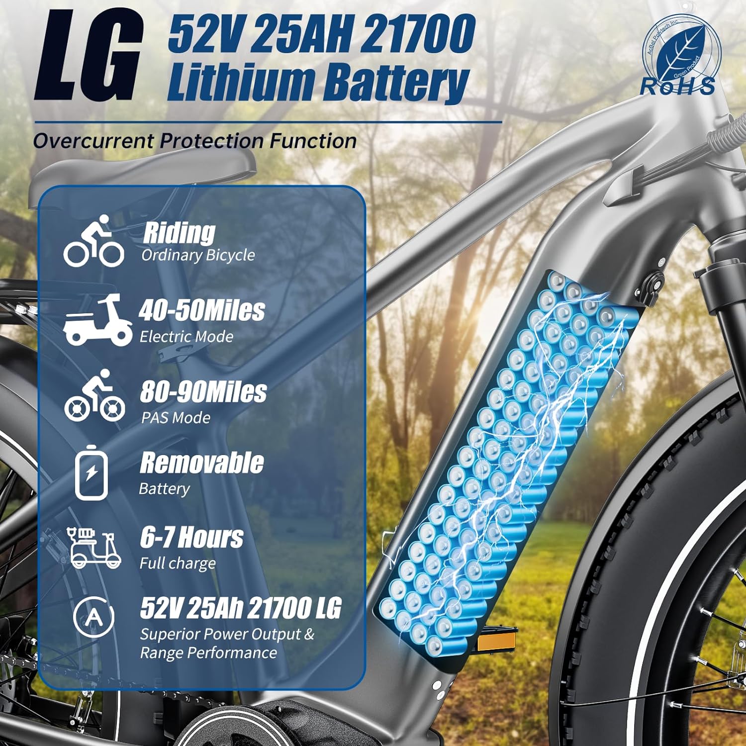 - [LARGE CAPACITY LG LITHIUM BATTERY] Our EBike is equipped with 48V/20Ah 21700 large capacity LG lithium battery, which provides 6 hours fast charge. The battery is removable,hidden, waterproof and convenient to bring home or office for charging.You can enjoy extended rides without worrying about running out of power.